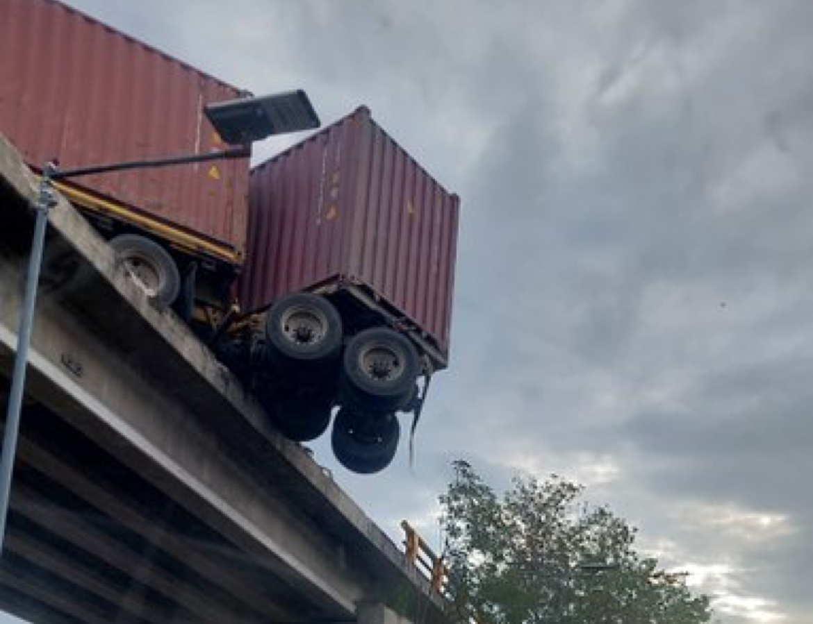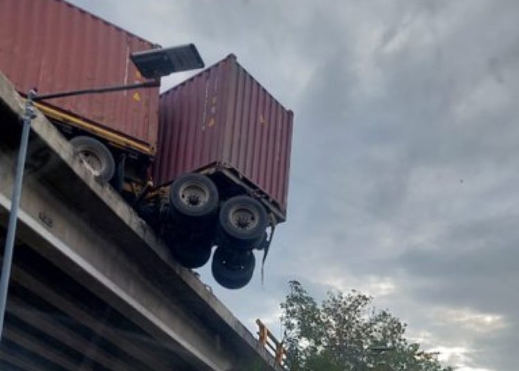 Edomex.- Esta tarde un tráiler de doble semi remolque que transitaba por un puente quedó colgado en la Avenida 1º de Mayo en Naucalpan, Estado de México.
