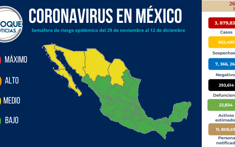 Respecto a las defunciones, Ciudad de México, el foco de la pandemia, acumula cerca del 18 % de todos los decesos a nivel nacional. Desde el 29 de noviembre y hasta el 14 de diciembre, 27 de los 32 estados del país estarán en semáforo de riesgo epidemiológico en color verde (riesgo bajo de contagios) y cinco en color amarillo (riesgo medio), ninguno en naranja (riesgo alto) ni en rojo (máximo riesgo). México no ha tomado medidas sobre la nueva variante del coronavirus detectada en Sudáfrica, de la cual este viernes la Organización Mundial de la Salud (OMS) dijo que es “de riesgo” y la bautizó como ómicron.