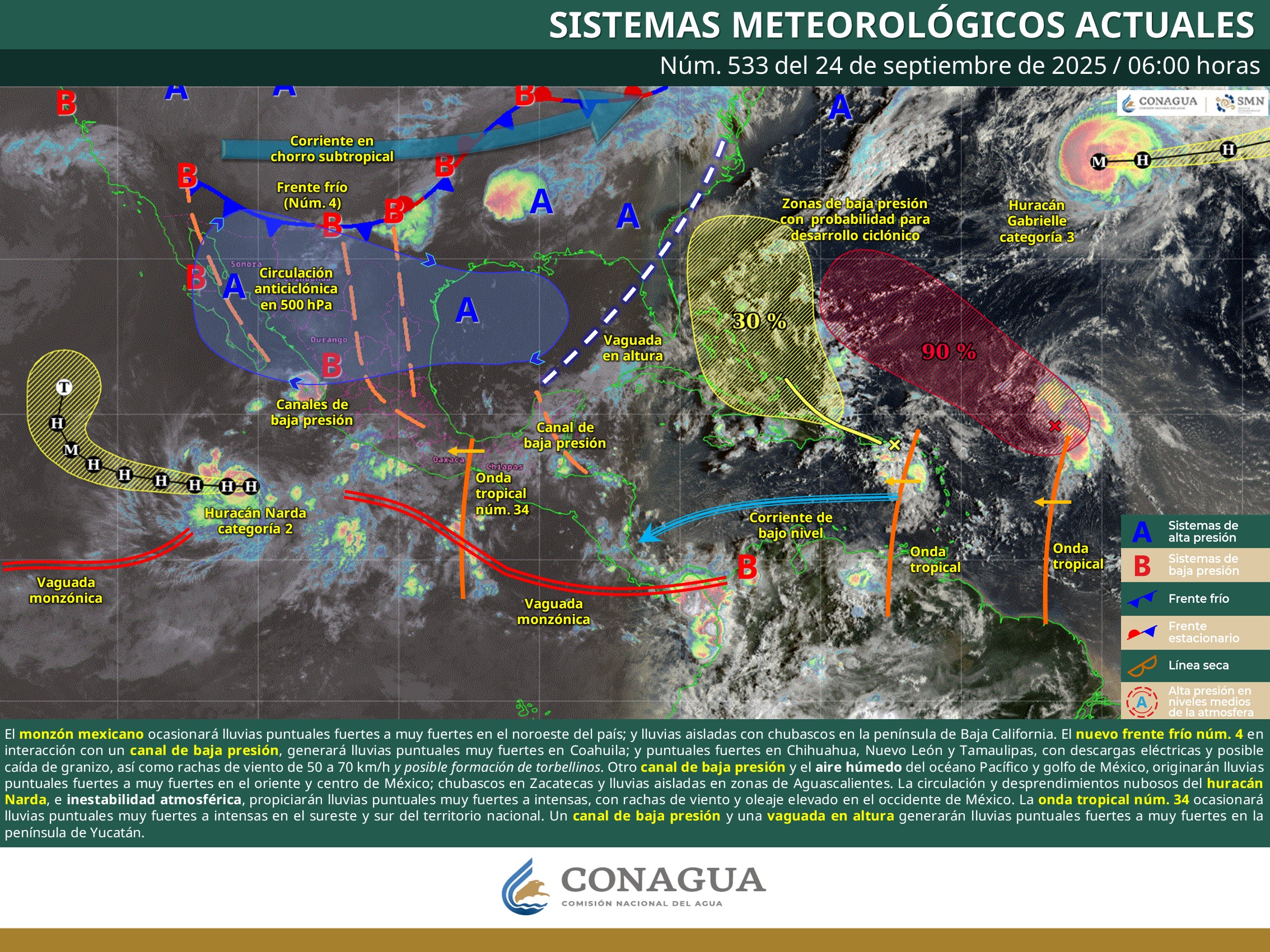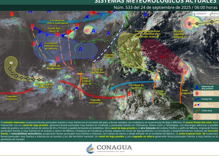 México.- El monzón mexicano, junto con el ingreso del frente frío núm. 4, canales de baja presión y la circulación del huracán Narda, provocarán lluvias intensas en gran parte del país. Además, la onda tropical núm. 34 reforzará las precipitaciones en el sur y sureste.
