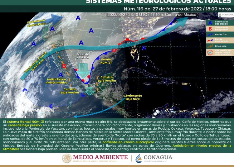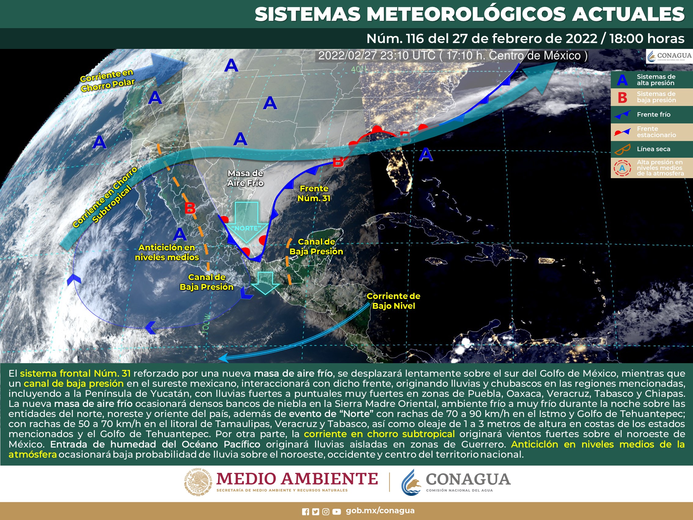 México.- El sistema frontal Núm. 31 se desplazará lentamente, localizándose al final de la tarde sobre la Península de Yucatán, ocasionará lluvias y chubascos en la región mencionada, así como en entidades del oriente y sureste del país, con lluvias puntuales muy fuertes en Veracruz y Oaxaca. La masa de aire frío asociada al frente, continuará generando densos bancos de niebla en la Sierra Madre Oriental y el sureste mexicano, ambiente frío a muy frío durante la mañana y noche sobre el norte, noreste y oriente de la República Mexicana, con heladas matutinas en sus zonas altas.